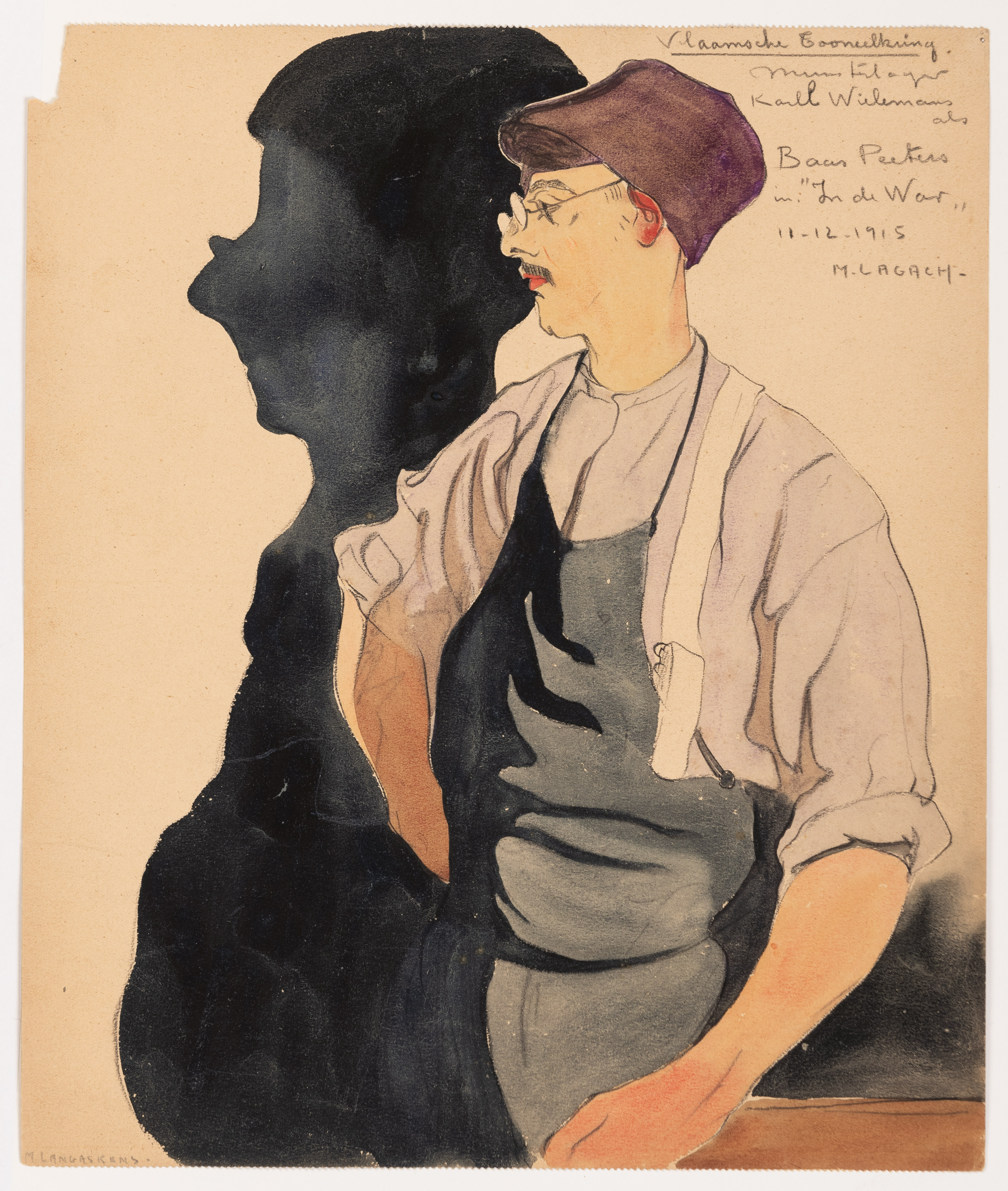 Inscribed Vlaamsche Tooneelkring./ Munsterlager / Karl Wielemans / als / Baas Peeters / in “In de War” / 11-12-1915 / M. LAGACH- at the upper right.