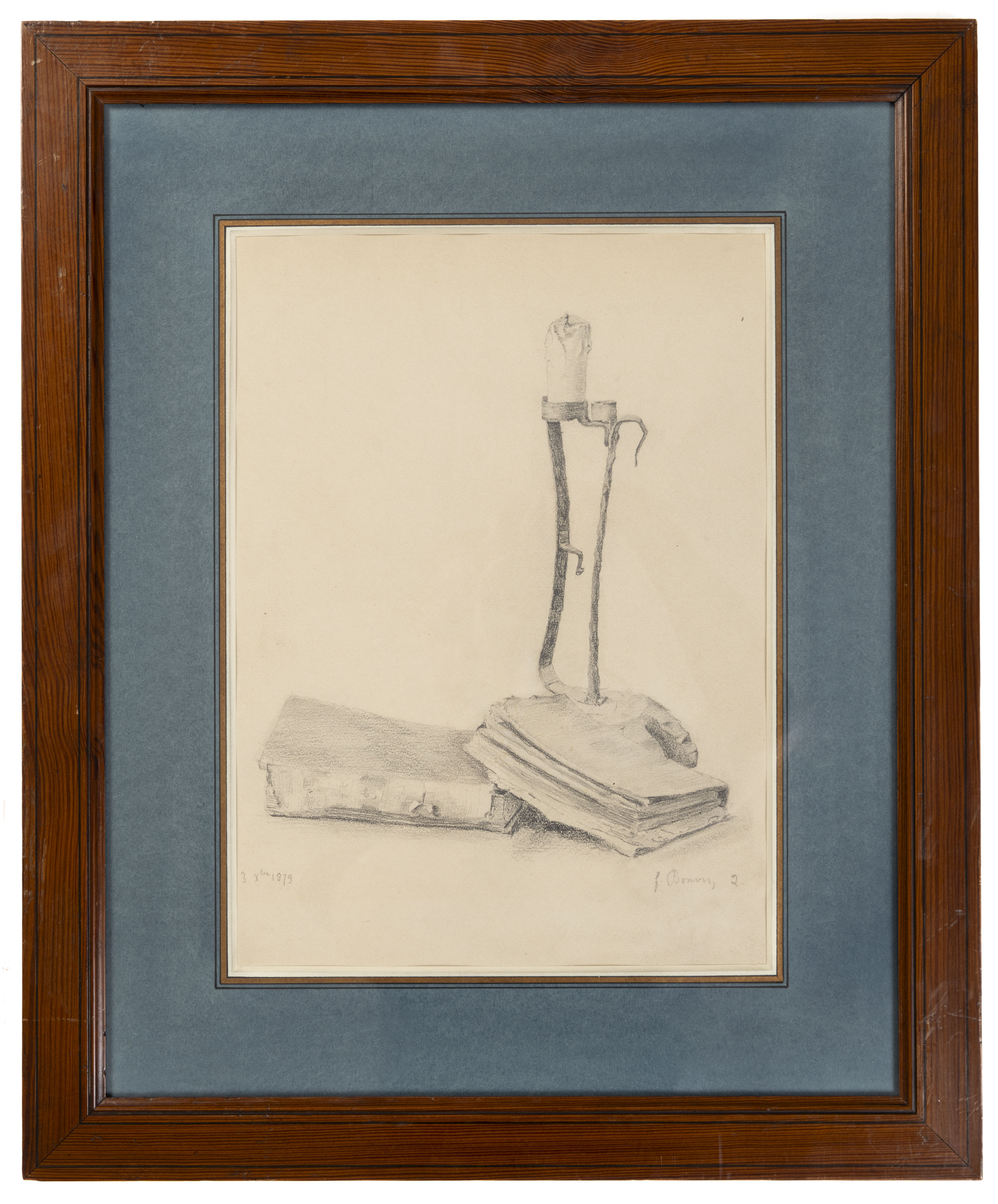 Drawn on what was, for Bonvin, a fairly large sheet of paper, this still life is dated the 3rd of October 1879. That year was not a particularly productive one for the artist, who was often ill and overwhelmed by physical pain. The artist remained largely confined to his home and chose to depict the mundane objects that surrounded him. Only a handful of dated paintings and drawings, almost all of still life subjects and of modest dimensions, survive from this year. One of these, a small black chalk drawing of a similar subject of a candle and a book alongside a pair of scissors, today in a private collection, was drawn three days after the present sheet.