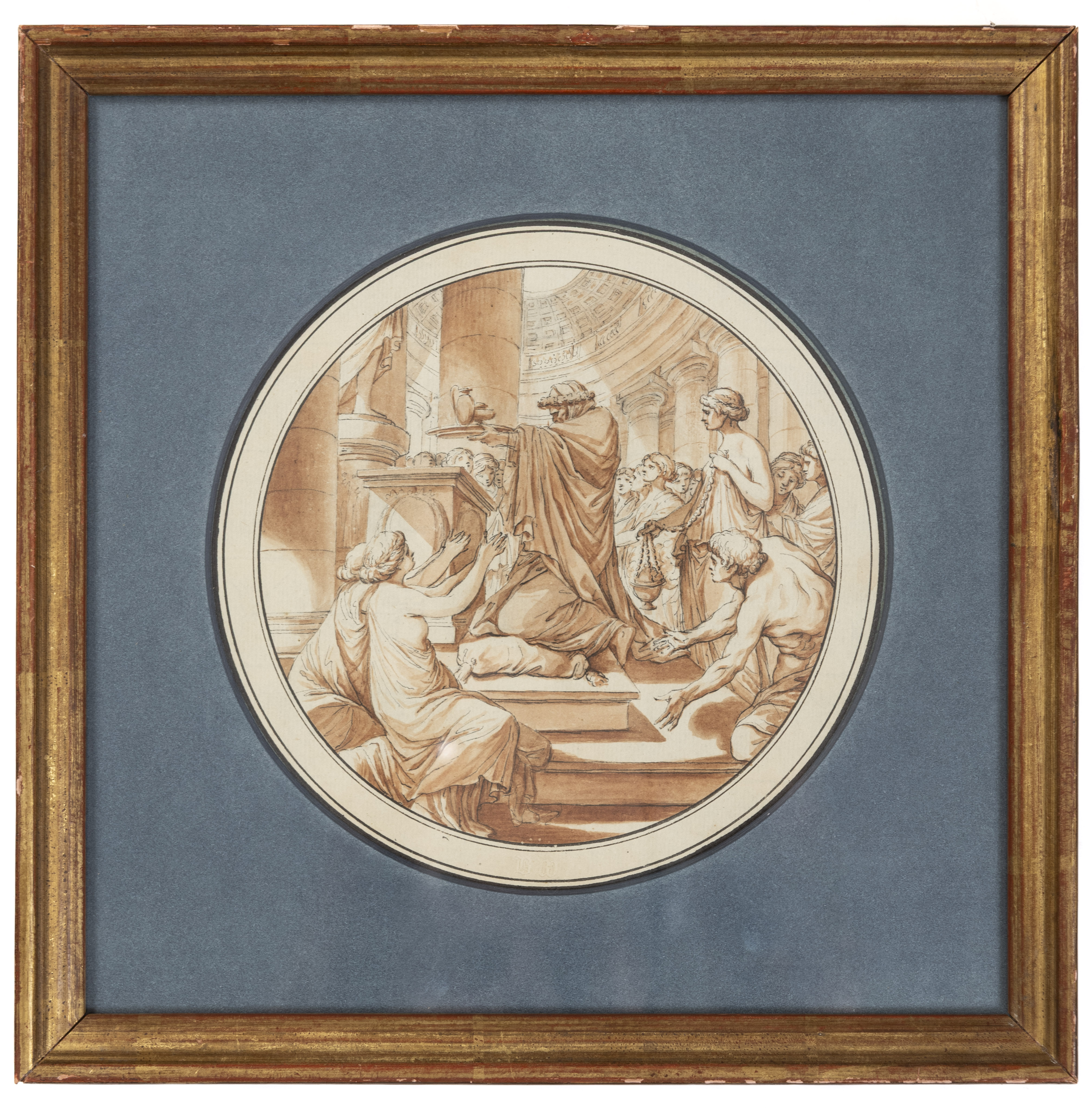 The tondo framing of the present drawing echoes classical medallion formats. In the early 1770s, Pajou was responsible for creating a series of designs for medals and tokens, the majority of which are in black chalk. Amongst these is a large sheet commemorating the royal visit to Cherbourg, in the Bibliotèque Nationale, and another design commemorating the birth of the Dauphin de France, which appeared at auction in 2003.