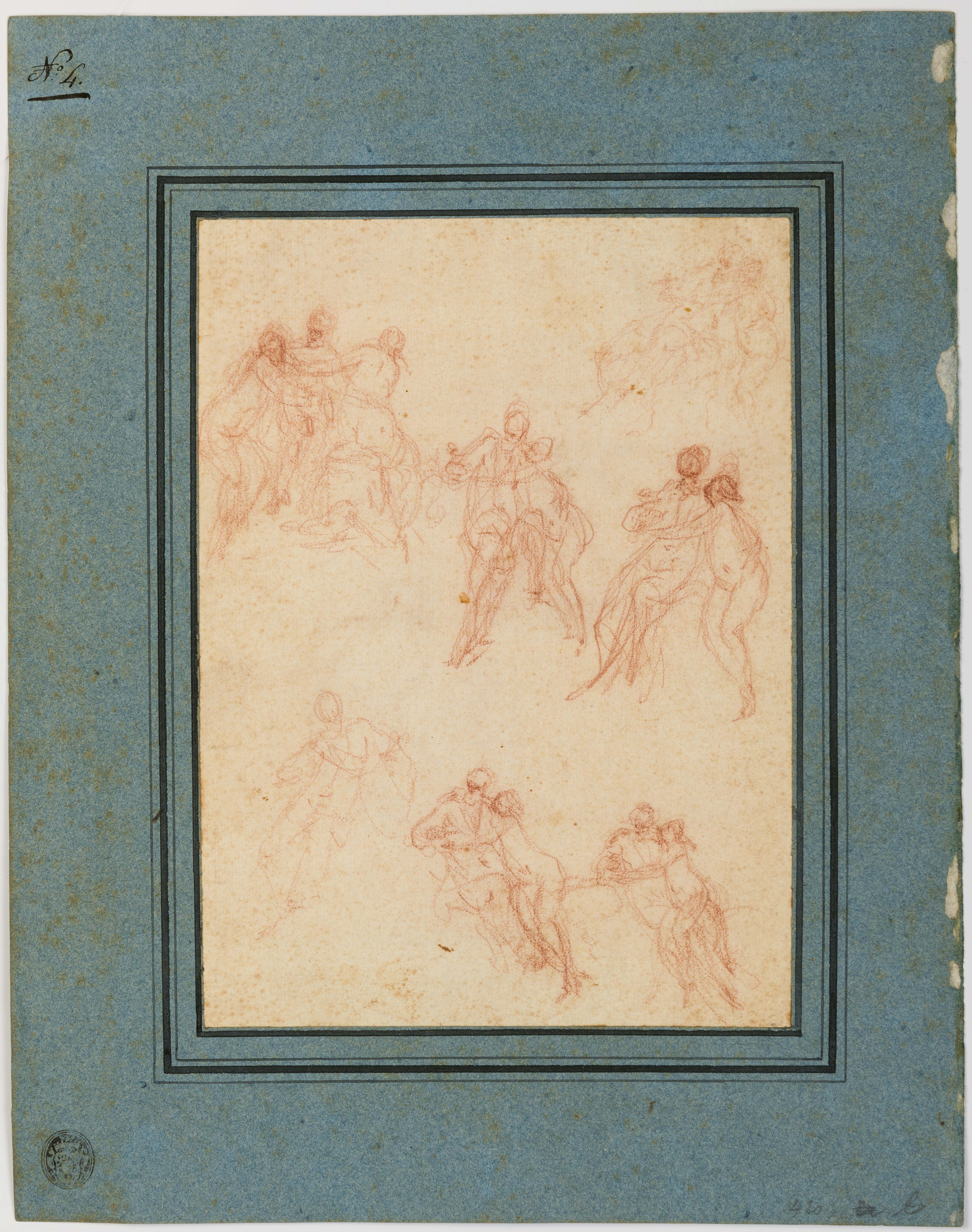 As Catherine Monbeig Goguel has noted, ‘Furini shares with all of the artists who trained directly or through their own master at the school of [Ludovico] Cigoli (Cristofano Allori, [Giovanni] Bilivert, [Sigismondo] Coccapani, [Andrea] Commodi) the practice of multiple studies, accumulated on the same sheet. This way of working allows for the rapid juxtaposition of various arrangements of the same subject or subjects of a different nature, mixing the sacred and the mythological, but involving the same compositional canon. The ability to arrange figures dynamically, a gift for layout, the subtlety of corrections and revisions are all characteristics of these study sheets.’ A number of comparable drawings containing red chalk studies of different compositions by Furini are in the Uffizi.