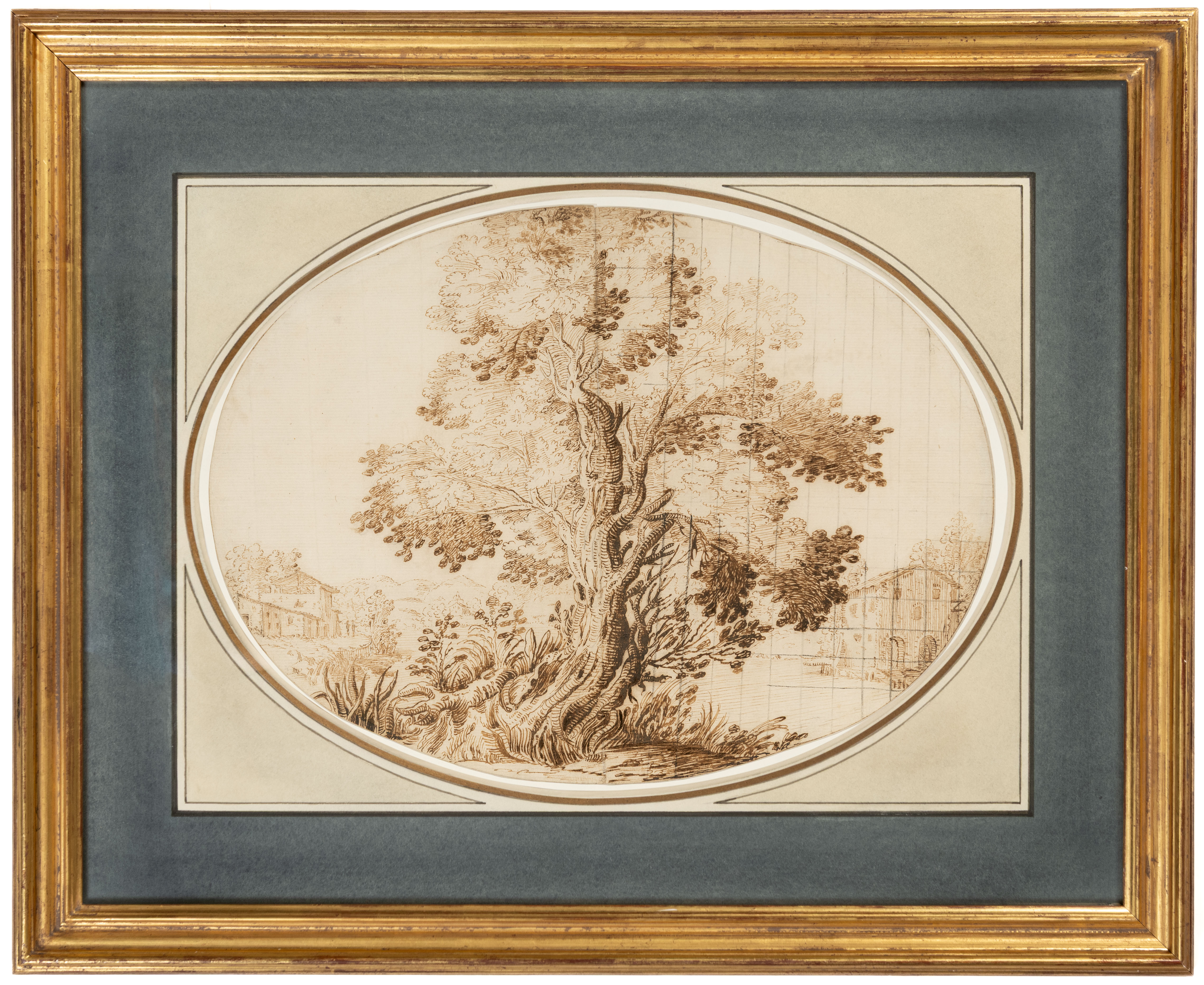 This large sheet is a typical example of the work for which Remigio Cantagallina was praised by the Florentine biographer Filippo Baldinucci. The framing lines indicate that the drawing was always intended to be oval in shape, which makes it something of a rarity among the artist’s corpus of drawings. Another finished oval landscape drawing by Cantagallina, of similar dimensions to the present sheet, is in the Uffizi, which also houses an additional oval drawing with a vertical orientation.