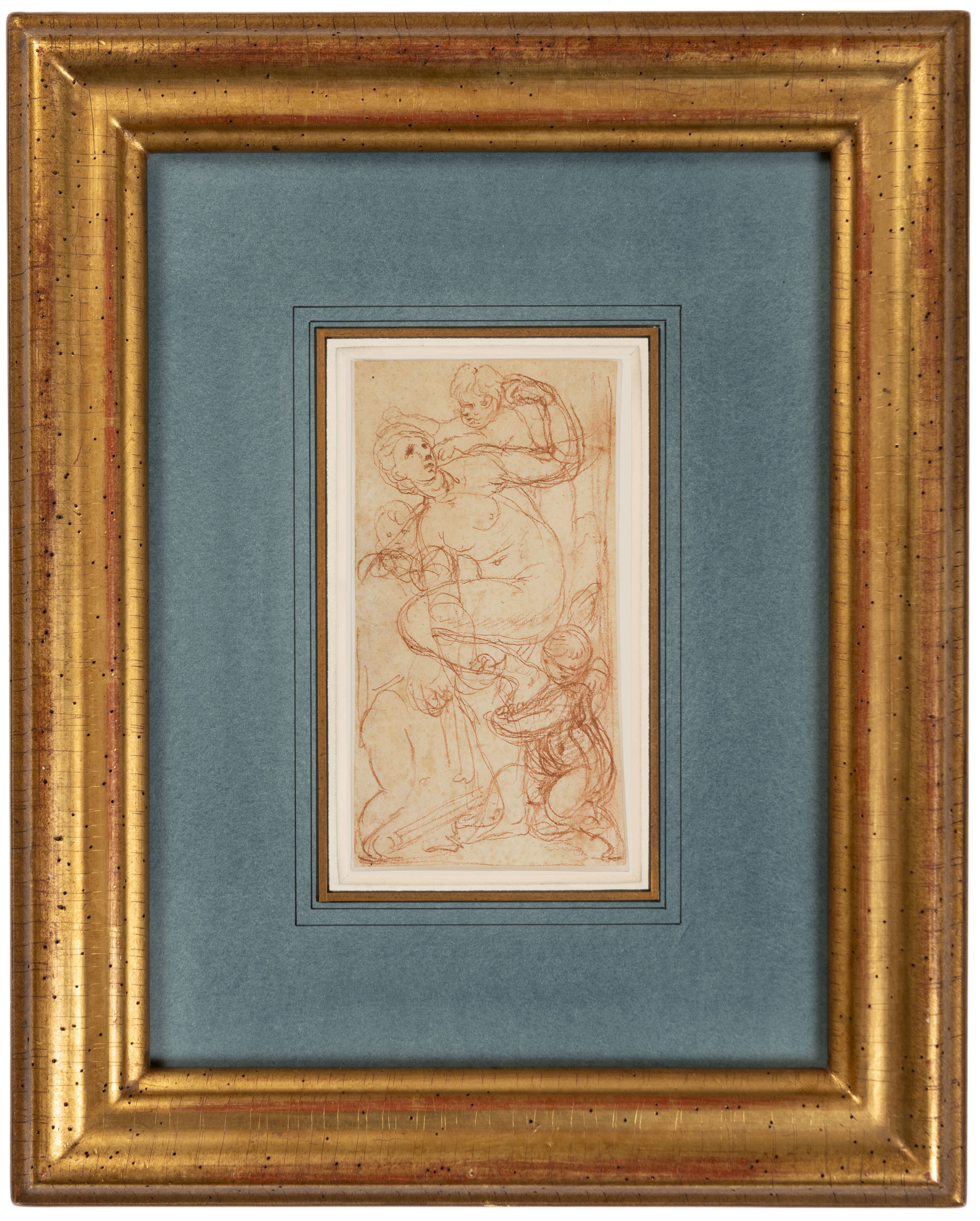 The style and subject of this spirited drawing would suggest that it dates from the final phase of Perino del Vaga’s career, when he was working on his last major fresco cycle; the extensive decoration of the papal apartments of the Castel Sant’Angelo in Rome, executed between June 1545 and his death in October 1547. In particular this drawing may be related to the frescoes illustrating the story of Psyche in a room in the Castel Sant’Angelo known as the Sala di Psiche, for which the final payment to the artist was made in May 1546. A somewhat comparable figure of a crouching female nude, albeit without the attendant putti seen in the present sheet, appears at the right of a fresco of Psyche Discovering Cupid and Cupid Fleeing in the Sala di Psiche.
