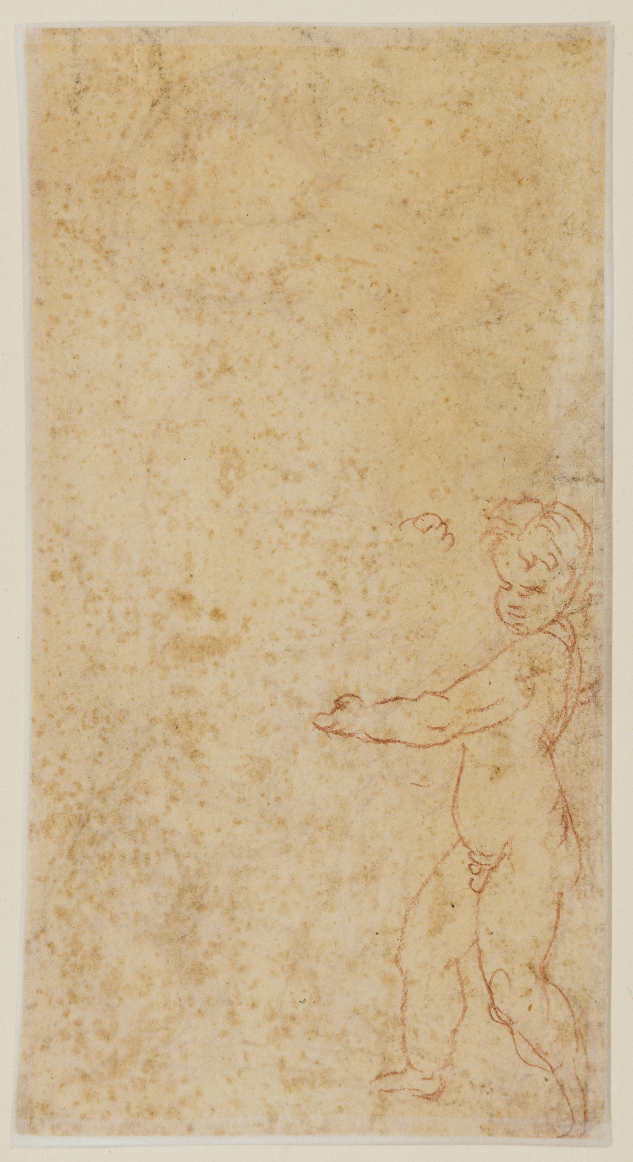If the present sheet was not intended to be used for a narrative scene, its narrow upright format, as well as the rough vertical lines drawn at the left and right edges of the sheet, suggest it may perhaps have been used to prepare a figure in a niche flanking a larger narrative composition, such as is found, for example, on the walls of the Sala Paolina of the Castel Sant’Angelo, painted in 1547. Certainly, the composition of twisting, animated figures set within a confined space would be appropriate to such a purpose. While the small study of an isolated putto on the verso of the present sheet was perhaps drawn to finalize the pose of one of the putti on the recto, it may be noted that similar putti also appear throughout the frescoes by Perino and his studio in the Castel Sant’Angelo, as for example in the Sala del Perseo. Indeed, a similarly posed putto is found on both sides of a pen and wash drawing by Perino del Vaga in the British Museum, which can be related to the frieze decorations in the Sala del Perseo.