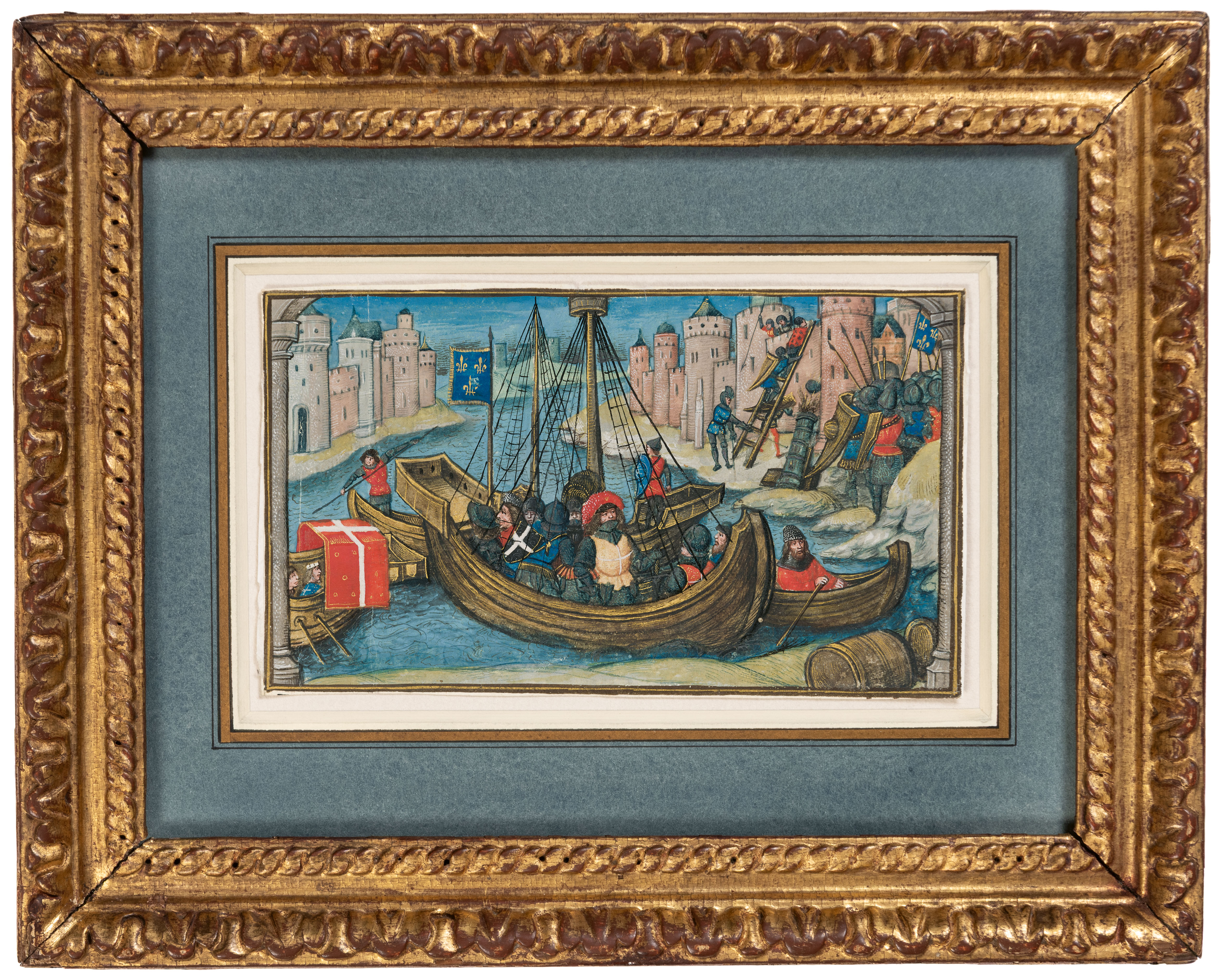 The author of this miniature of The Assault on the Chastel de Saint Forget is the anonymous Flemish illuminator known as The Master of Bruges or The Master of 1482, who was active at the court in Bruges in the 1480s and 1490s. As Sandra Hindman has noted of the present sheet, ‘Variously attributed to the Flemish Master of 1482, who worked in Bruges, and the French Mamerot Master, who worked in Bourges, this miniature comes from a chronicle of the Hundred Year’s War. In our opinion, the palette, the figures, and the composition support an attribution to the Master of 1482. One of the most striking features of this miniature is the bold palette with splashes of bright red paint, said to be a hallmark of the Master of 1482. Of the thirteen miniatures that come from the same manuscript and were originally bound into the Burckhardt-Wildt album, this one is among the finest; the delicate modelling of the faces, the sketchy treatment of the surface of the water, and the sophisticated organization of the composition point to a gifted artist.’