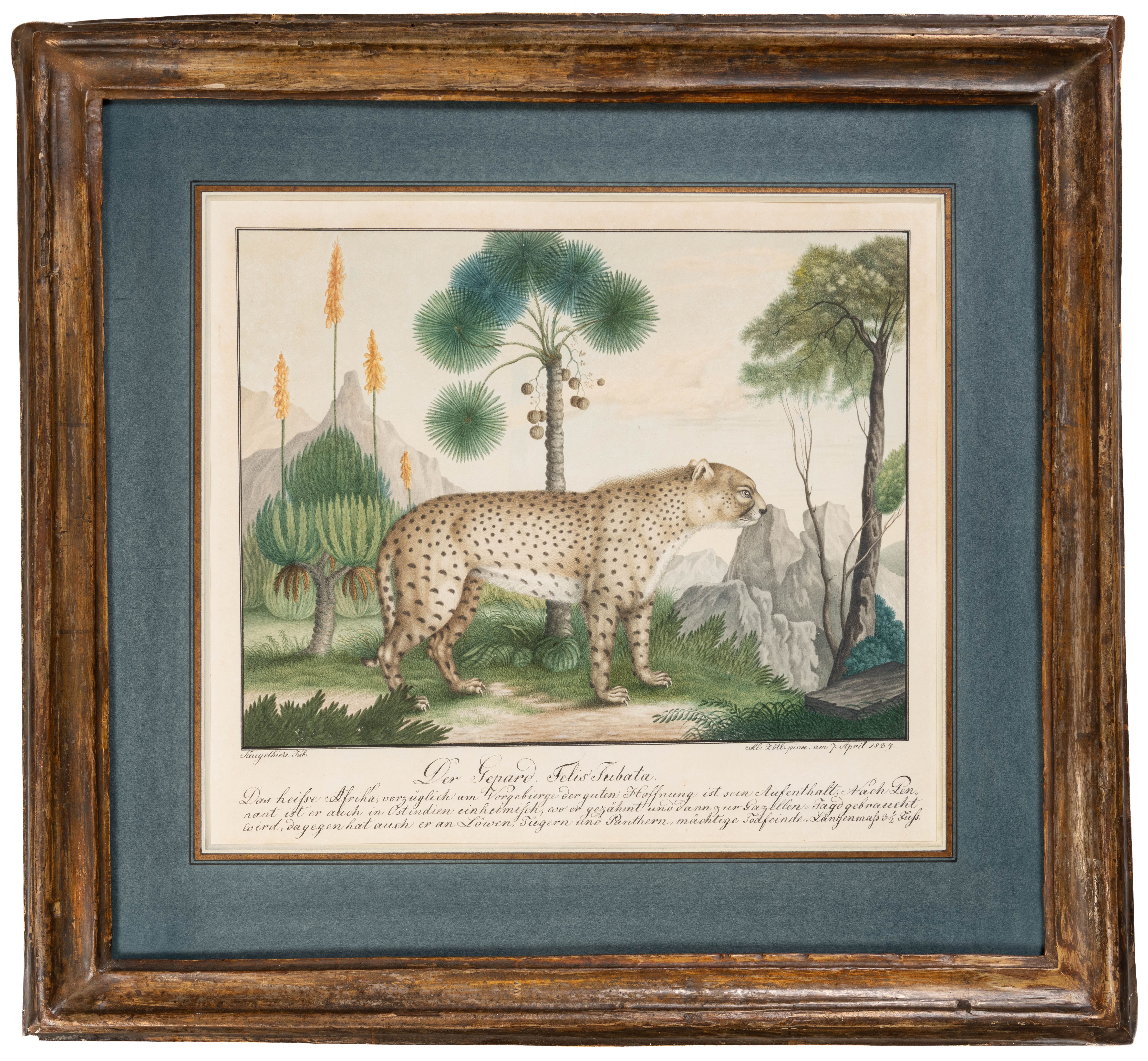 Further inscribed Der Gepard. Felis Jubata. / Das heisse Afrika, verzüglich am Vorgebierge der guten Hoffnung ist sein Aufenthalt. Nach Pen- / nant ist der auch in Ostindien einheimlich, wo er gezähmt und dann zur Gazellen Jagd gebraucht / wird, dagegen hat auch er an Löwen, Tiergern und Panthern, mächtige Todfeinde. Langenmass 3 1/2 Fuss. in black ink in the lower margin.